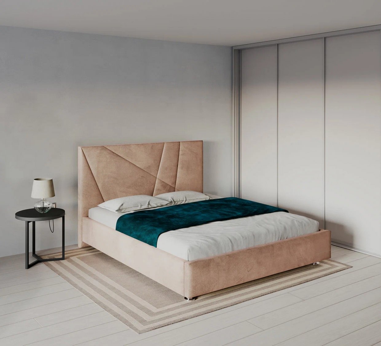 Мягкая интерьерная кровать Геометрия имеет высокую спинку с абстрактным рисунком. Может изготавливаться с размерами спальных мест шириной от 80 до 200 см в вариантах со стационарным или подъемным ортопедическими основаниями.