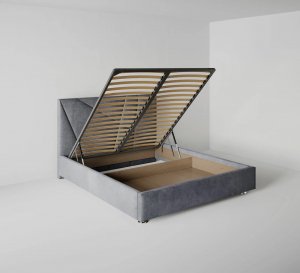 Мягкая интерьерная кровать Геометрия имеет высокую спинку с абстрактным рисунком. Может изготавливаться с размерами спальных мест шириной от 80 до 200 см в вариантах со стационарным или подъемным ортопедическими основаниями.