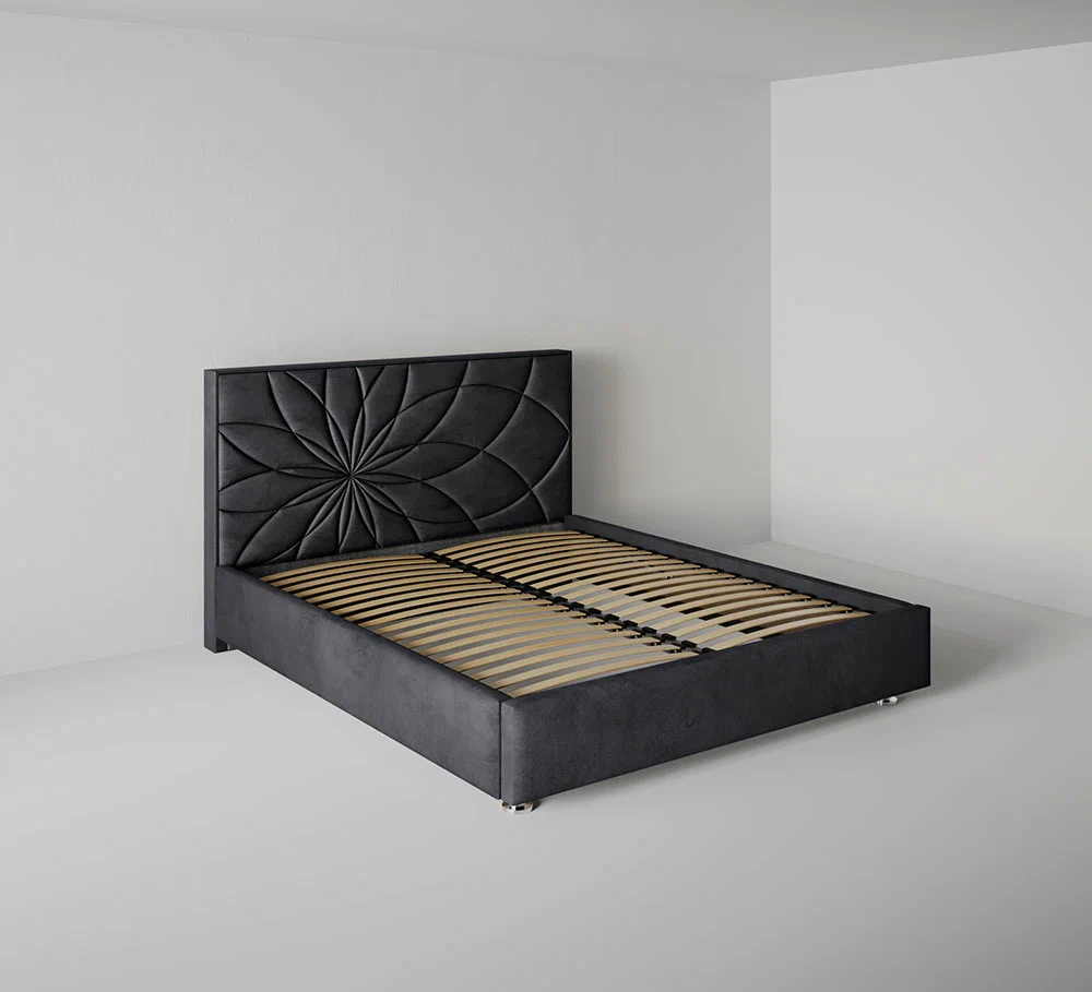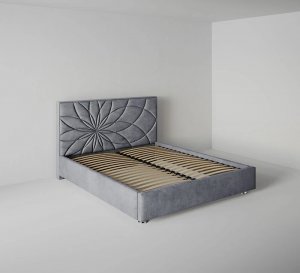 Мягкая интерьерная кровать Наоми оснащена высокой спинкой с вышитым на ней стильным геометричным абстрактным цветком. Может изготавливаться с размерами спальных мест шириной от 80 до 200 см в вариантах со стационарным или подъемным ортопедическими основаниями.