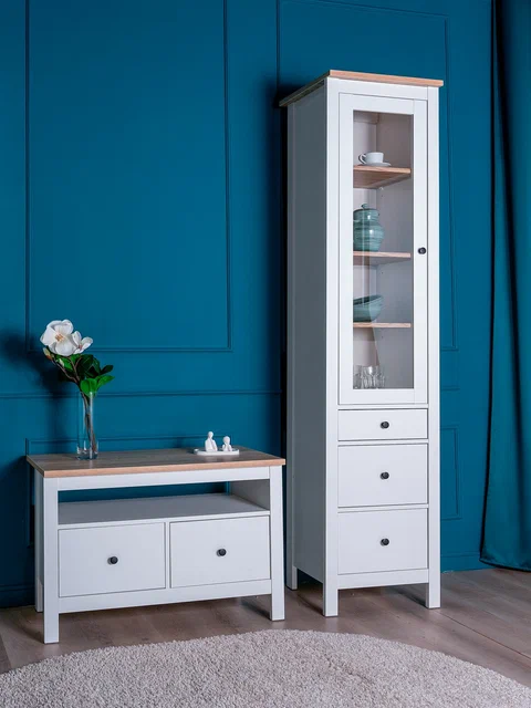 ГУД ЛАКК - знакомая мебель, которую легко купить и собрать! Шкаф с витриной САГА — это элегантное и практичное решение для вашей столовой или гостиной. Шкаф выполнен из высококачественного ДСП, который отвечает всем требованиям безопасности и экологичности (класс экобезопасности Е0,5). Шкаф имеет компактные размеры 50х41х215 см, что позволяет ему гармонично вписаться в любой интерьер. Внутри шкафа расположены три полки и три разноразмерных ящика, которые предоставляют достаточно места для хранения посуды и других предметов. Дверца шкафа выполнена со стеклом, что придает ему изысканный вид и позволяет демонстрировать содержимое шкафа. Этот шкаф идеально подойдёт для столовой или гостиной и станет прекрасным дополнением к вашему интерьеру. Он поможет организовать пространство и создаст уютную атмосферу в вашем доме.