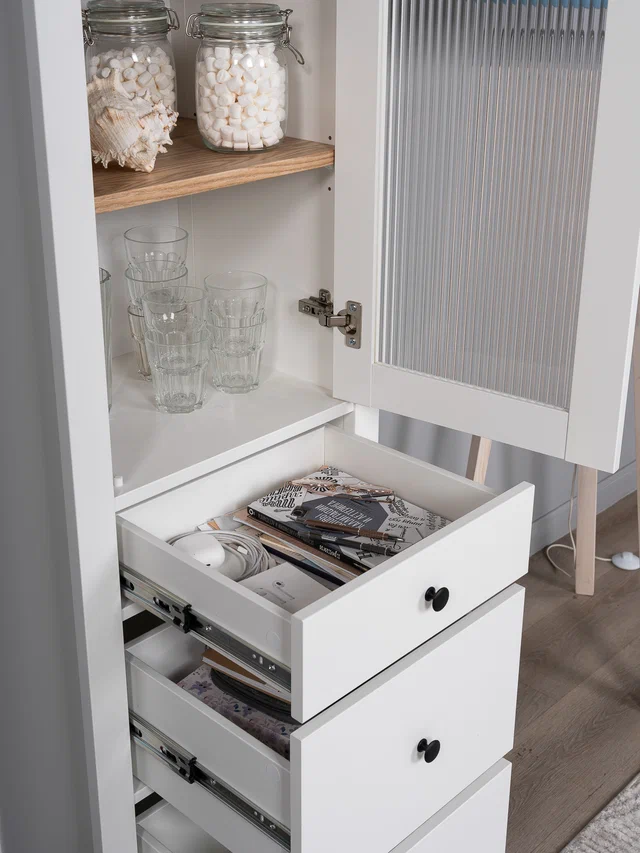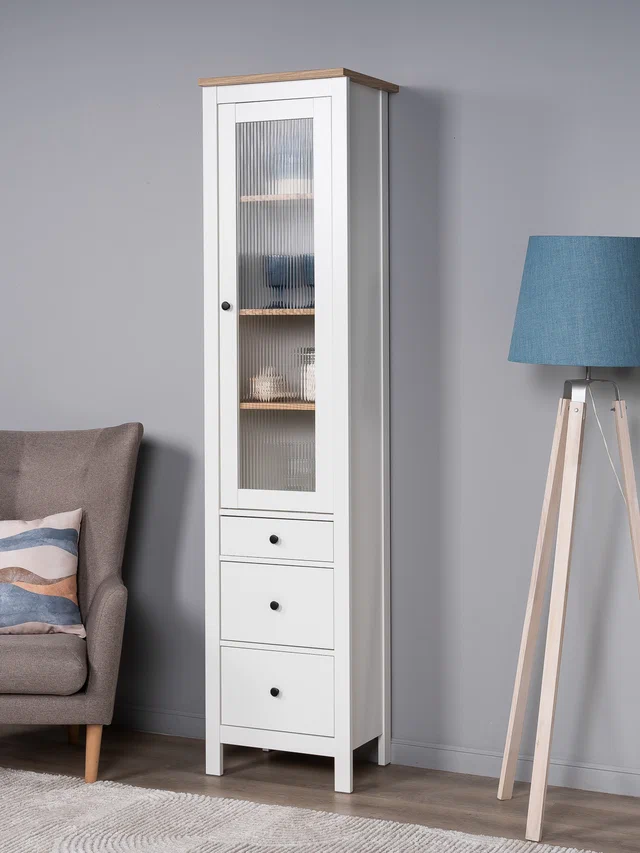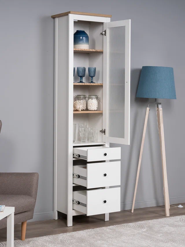 САГА шкаф с витриной 50? Шкаф с витриной САГА — это элегантное и функциональное решение для хранения, которое идеально сочетает в себе стиль, практичность и продуманный дизайн. Стеллаж оснащен тремя вместительными полками, регулирующимися по высоте, что позволяет гибко организовать пространство для хранения книг, посуды, декоративных элементов, фоторамок или других вещей. Дополнительно стеллаж оборудован тремя выдвижными ящиками, которые идеально подходят для хранения тех предметов, которые вы предпочитаете держать вне поля зрения. Ящики оснащены доводчиками и направляющими полного выдвижения, обеспечивающими плавное и бесшумное открывание, а также максимальное удобство в использовании. Благодаря такой продуманной конструкции, вы сможете легко адаптировать стеллаж под свои нужды и поддерживать порядок в доме.