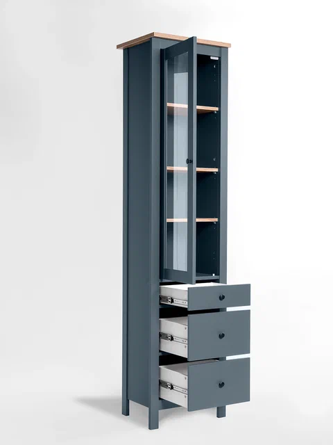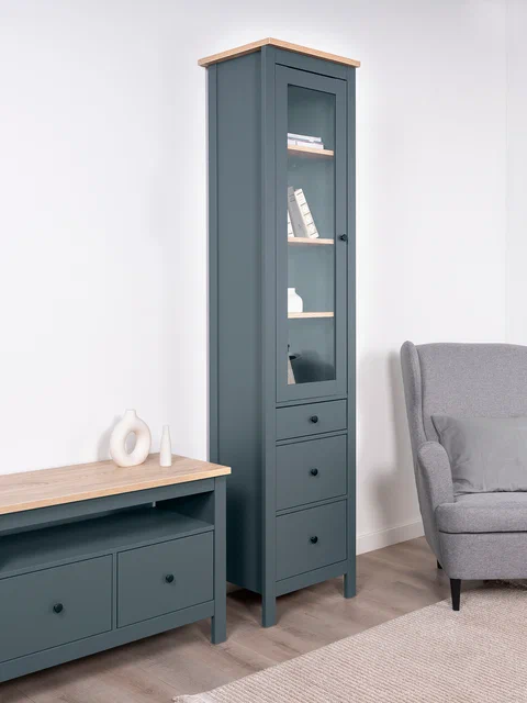 ГУД ЛАКК - знакомая мебель, которую легко купить и собрать! Шкаф с витриной САГА — это элегантное и практичное решение для вашей столовой или гостиной. Шкаф выполнен из высококачественного ДСП, который отвечает всем требованиям безопасности и экологичности (класс экобезопасности Е0,5). Шкаф имеет компактные размеры 50х41х215 см, что позволяет ему гармонично вписаться в любой интерьер. Внутри шкафа расположены три полки и три разноразмерных ящика, которые предоставляют достаточно места для хранения посуды и других предметов. Дверца шкафа выполнена со стеклом, что придает ему изысканный вид и позволяет демонстрировать содержимое шкафа. Этот шкаф идеально подойдёт для столовой или гостиной и станет прекрасным дополнением к вашему интерьеру. Он поможет организовать пространство и создаст уютную атмосферу в вашем доме.