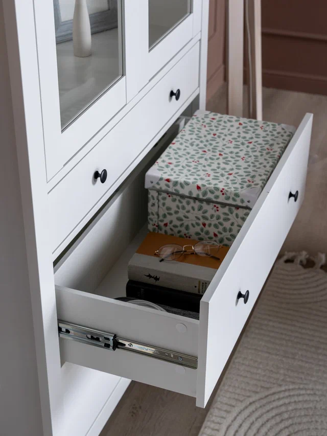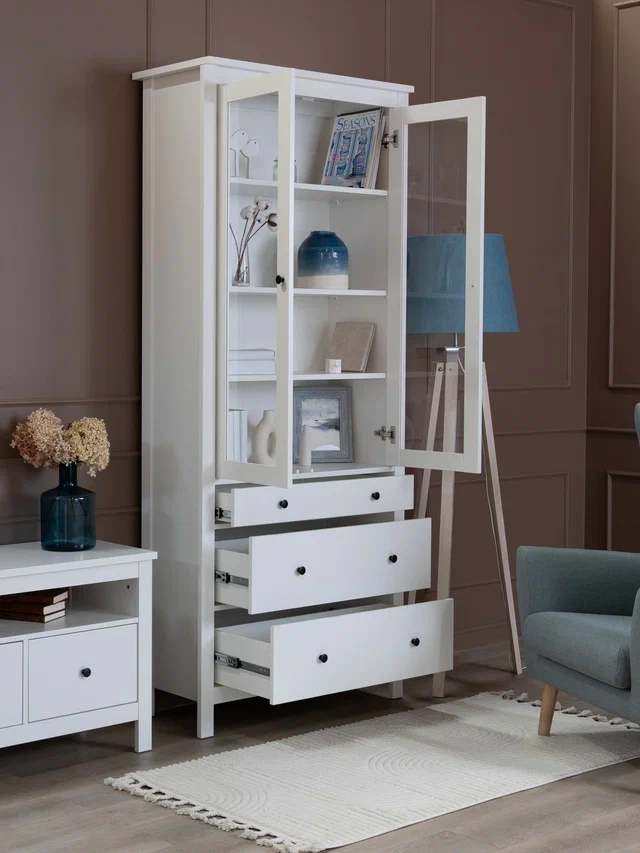 САГА шкаф с витриной 90? Шкаф с витриной САГА — это элегантное и функциональное решение для хранения, которое идеально сочетает в себе стиль, практичность и продуманный дизайн. Стеллаж оснащен тремя вместительными полками, регулирующимися по высоте, что позволяет гибко организовать пространство для хранения книг, посуды, декоративных элементов, фоторамок или других вещей. Дополнительно стеллаж оборудован тремя выдвижными ящиками, которые идеально подходят для хранения тех предметов, которые вы предпочитаете держать вне поля зрения. Ящики оснащены доводчиками и направляющими полного выдвижения, обеспечивающими плавное и бесшумное открывание, а также максимальное удобство в использовании. Благодаря такой продуманной конструкции, вы сможете легко адаптировать стеллаж под свои нужды и поддерживать порядок в доме.