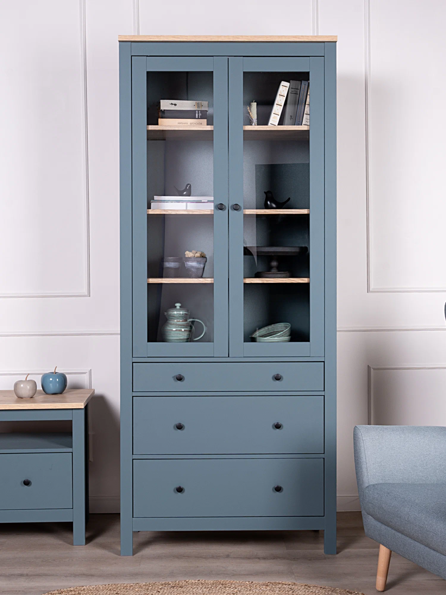 Шкаф Сага 90 с витриной, темно-бирюзовый/ясень в Екатеринбурге - gold-germes.ru | фото 4