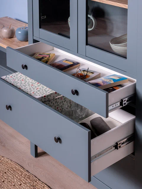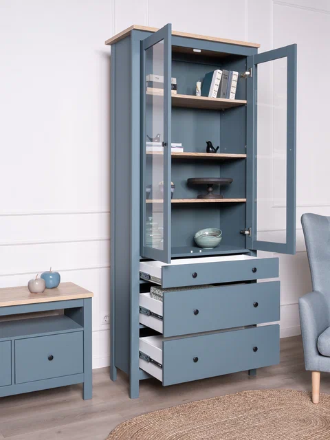САГА шкаф с витриной 90? Шкаф с витриной САГА — это элегантное и функциональное решение для хранения, которое идеально сочетает в себе стиль, практичность и продуманный дизайн. Стеллаж оснащен тремя вместительными полками, регулирующимися по высоте, что позволяет гибко организовать пространство для хранения книг, посуды, декоративных элементов, фоторамок или других вещей. Дополнительно стеллаж оборудован тремя выдвижными ящиками, которые идеально подходят для хранения тех предметов, которые вы предпочитаете держать вне поля зрения. Ящики оснащены доводчиками и направляющими полного выдвижения, обеспечивающими плавное и бесшумное открывание, а также максимальное удобство в использовании. Благодаря такой продуманной конструкции, вы сможете легко адаптировать стеллаж под свои нужды и поддерживать порядок в доме.