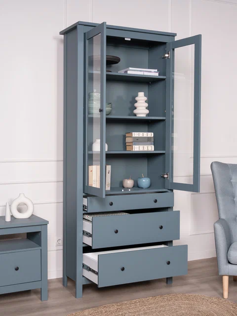 САГА шкаф с витриной 90? Шкаф с витриной САГА — это элегантное и функциональное решение для хранения, которое идеально сочетает в себе стиль, практичность и продуманный дизайн. Стеллаж оснащен тремя вместительными полками, регулирующимися по высоте, что позволяет гибко организовать пространство для хранения книг, посуды, декоративных элементов, фоторамок или других вещей. Дополнительно стеллаж оборудован тремя выдвижными ящиками, которые идеально подходят для хранения тех предметов, которые вы предпочитаете держать вне поля зрения. Ящики оснащены доводчиками и направляющими полного выдвижения, обеспечивающими плавное и бесшумное открывание, а также максимальное удобство в использовании. Благодаря такой продуманной конструкции, вы сможете легко адаптировать стеллаж под свои нужды и поддерживать порядок в доме.