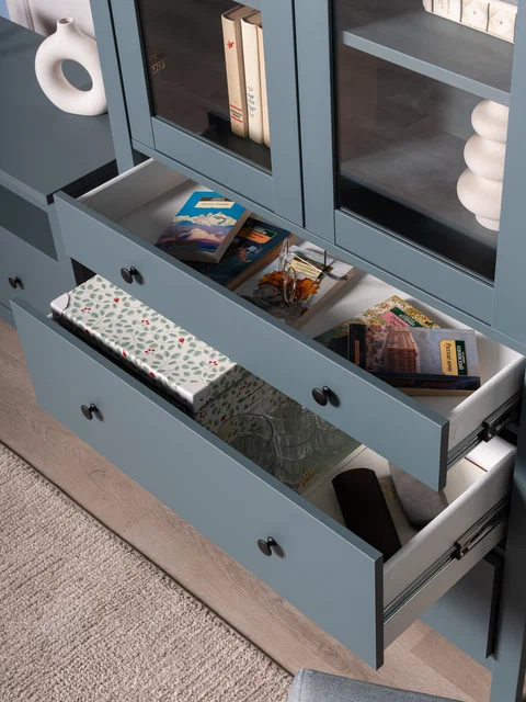 Стеклянные дверцы с доводчиками добавляют стеллажу изысканности и элегантности, а также надежно защищают ваши вещи от пыли, сохраняя их в идеальной чистоте. Это сочетание функциональности и стиля делает стеллаж не только практичным решением для хранения, но и эффектным элементом интерьера, который подчеркнет ваш вкус и добавит уюта в пространство.