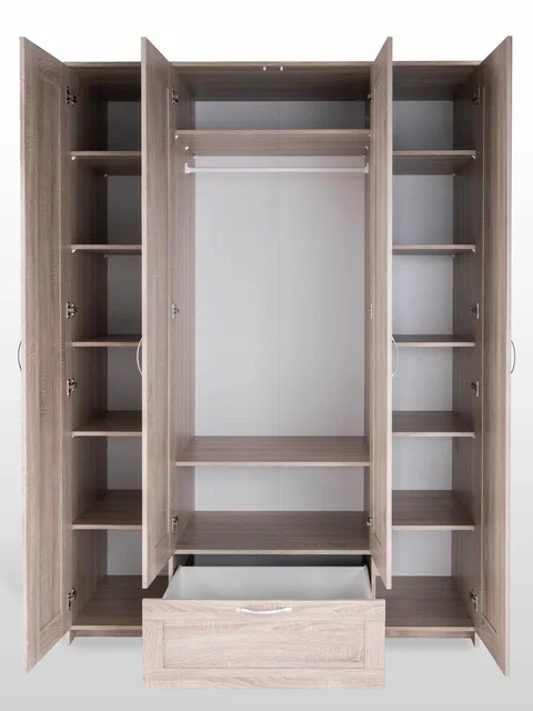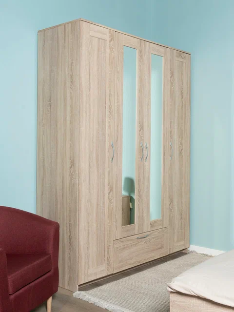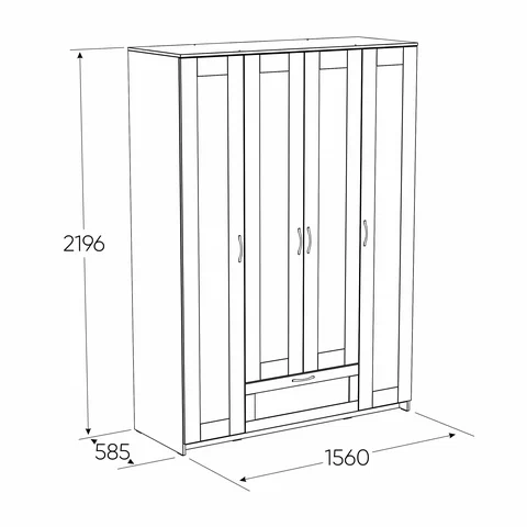 ГУД ЛАКК - знакомая мебель, которую легко купить и собрать! СИРИУС шкаф комбинированный 4 двери и 1 ящик с зеркалом— элегантность и качество в каждой детали! Серия мебели СИРИУС вдохновлена популярной серией BRIMNES от IKEA, и станет идеальным дополнением вашей квартиры. Почему выбирают СИРИУС шкаф комбинированный 4 двери и 1 ящик с зеркалом? Этот шкаф СИРИУС с увеличенной высотой — 220 см, для максимального использования пространства! Шкаф Сириус — это стильное и функциональное решение для хранения, которое сочетает в себе практичность, элегантный дизайн и продуманную организацию пространства. Филенчатые фасады придают шкафу изысканный вид, делая его украшением любого интерьера, а зеркало позволит подобрать идеальный образ. Внутри шкафа расположена прочная платяная штанга, на которой можно разместить одежду на плечиках, сохраняя ее в идеальном состоянии. Просторное внутреннее пространство с тремя дверцами позволяет организовать хранение одежды, обуви, аксессуаров или других вещей. Внешний выдвижной ящик с удобной ручкой предназначен для хранения мелких вещей, аксессуаров или белья. Его можно использовать, не открывая дверцы шкафа, что делает доступ к вещам быстрым и удобным. Так же внутри есть 12 полок, которые можно отрегулировать по высоте для разных вещей. Шкаф имеет оптимальные размеры, что делает его подходящим для небольших помещений, таких как спальни, прихожие, гостевые комнаты или даже гардеробные. Он не занимает много места, при этом остается вместительным.